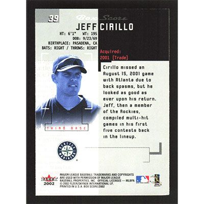 This is a 2002 Fleer Box Score Jeff Cirillo baseball card. The card is #39 and pictures show condition.