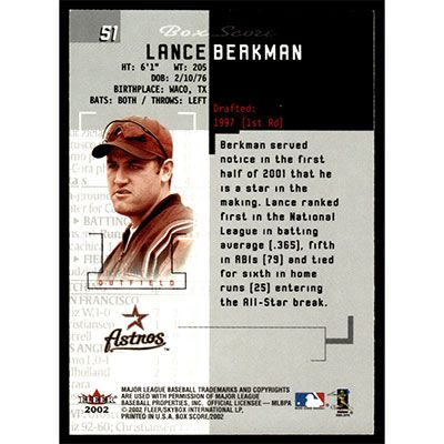 This is a 2002 Fleer Box Score Lance Berkman baseball card. The card is #51 and pictures show condition.