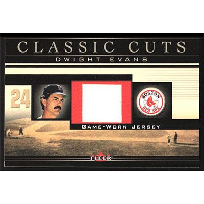 This is a 2002 Fleer Classic Cuts Game Used Dwight Evans Jersey baseball card. The card is #DE-J and pictures show condition.