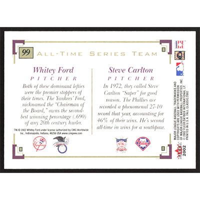 This is a 2002 Fleer Fall Classics Whitey Ford and Steve Carlton baseball card. The card is #99 and pictures show condition. Team(s): New York Yankees/Philadelphia Phillies