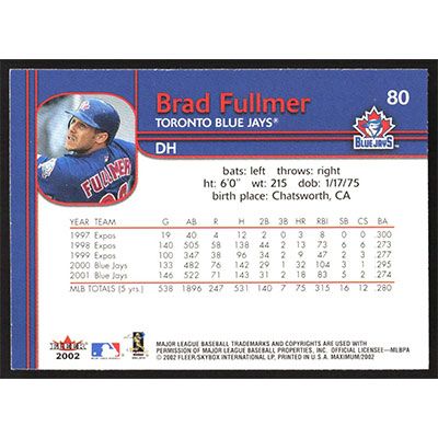 This is a 2002 Fleer Maximum Brad Fullmer baseball card. The card is #80 and pictures show condition.