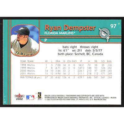 This is a 2002 Fleer Maximum Ryan Dempster baseball card. The card is #97 and pictures show condition.