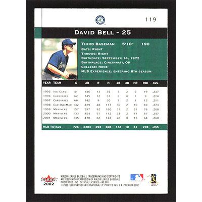 This is a 2002 Fleer Premium David Bell baseball card. The card is #119 and pictures show condition.