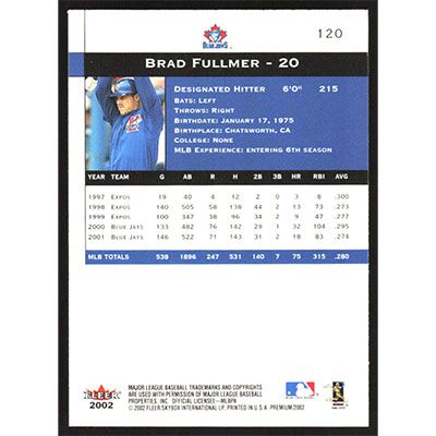 This is a 2002 Fleer Premium Brad Fullmer baseball card. The card is #120 and pictures show condition.