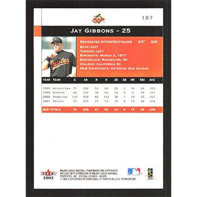 This is a 2002 Fleer Premium Jay Gibbons baseball card. The card is #187 and pictures show condition.