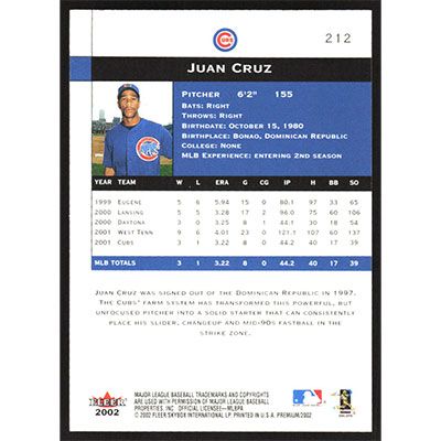 This is a 2002 Fleer Premium Juan Cruz Premium Prospects baseball card. The card is #212 and pictures show condition.