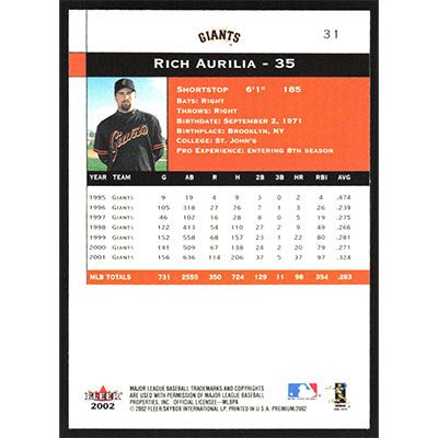 This is a 2002 Fleer Premium Rich Aurilia baseball card. The card is #31 and pictures show condition.
