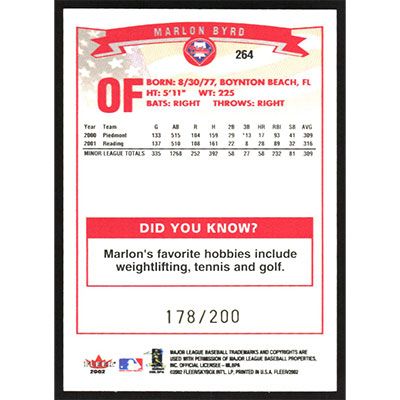 This is a 2002 Fleer Tiffany Marlon Byrd baseball card. The card is #264 and pictures show condition. This card is limited; #'d 178/200. Team(s): Philadelphia Phillies
