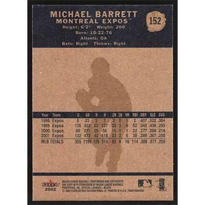 This is a 2002 Fleer Tradition Michael Barrett baseball card. The card is #152 and pictures show condition.
