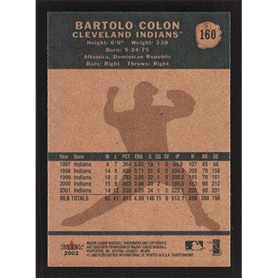 This is a 2002 Fleer Tradition Bartolo Colon baseball card. The card is #160 and pictures show condition.