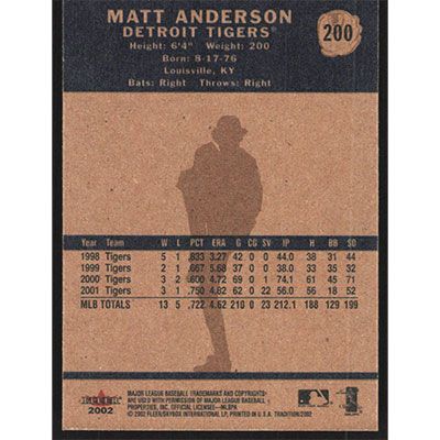 This is a 2002 Fleer Tradition Matt Anderson baseball card. The card is #200 and pictures show condition.