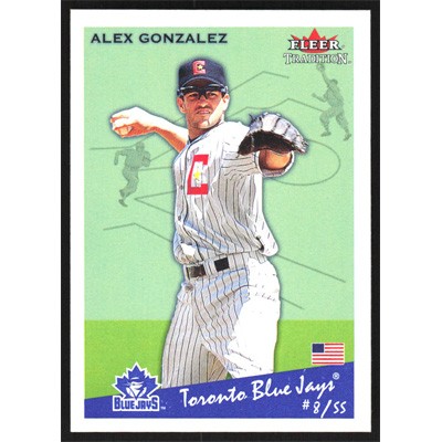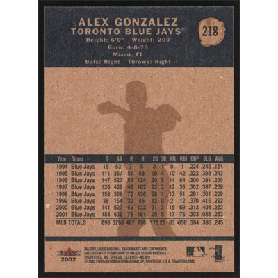 This is a 2002 Fleer Tradition Alex Gonzalez baseball card. The card is #218 and pictures show condition.
