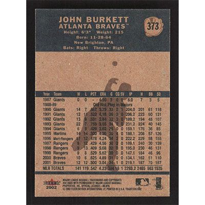 This is a 2002 Fleer Tradition John Burkett baseball card. The card is #373 and pictures show condition.