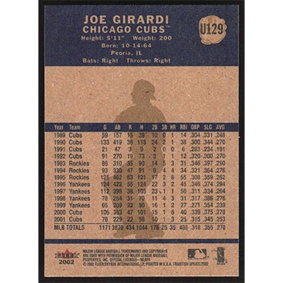 This is a 2002 Fleer Tradition Update Joe Girardi baseball card. The card is #U129 and pictures show condition.