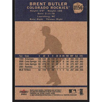 This is a 2002 Fleer Tradition Update Brent Butler baseball card. The card is #U156 and pictures show condition.
