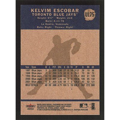 This is a 2002 Fleer Tradition Update Kelvim Escobar baseball card. The card is #U175 and pictures show condition.