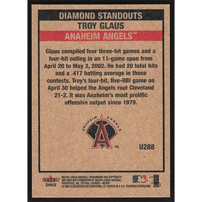 This is a 2002 Fleer Tradition Update Troy Glaus Diamond Standouts baseball card. The card is #U288 and pictures show condition.