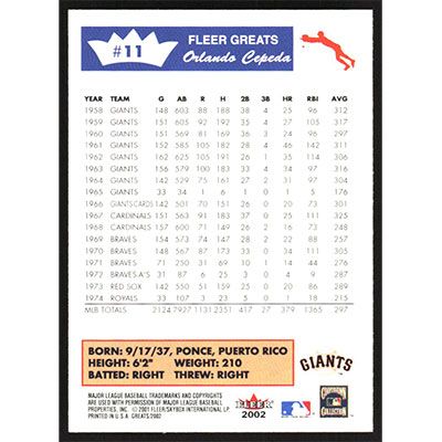 This is a 2002 Greats of the Game Orlando Cepeda baseball card. The card is #11 and pictures show condition.