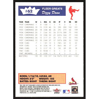 This is a 2002 Greats of the Game Dizzy Dean baseball card. The card is #62 and pictures show condition.