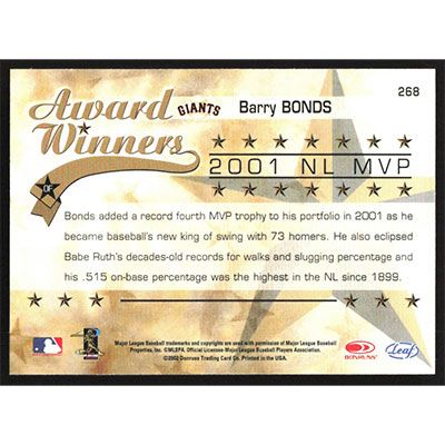 This is a 2002 Leaf Rookies & Stars Barry Bonds '01 MVP baseball card. The card is #268 and pictures show condition.