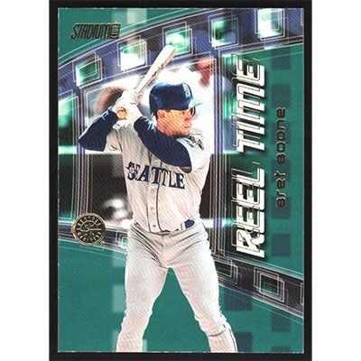 This is a 2002 Stadium Club Reel Time Bret Boone baseball card. The card is #RT15 and pictures show condition.