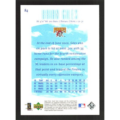 This is a 2002 Sweet Spot Brian Giles baseball card. The card is #84 and pictures show condition.