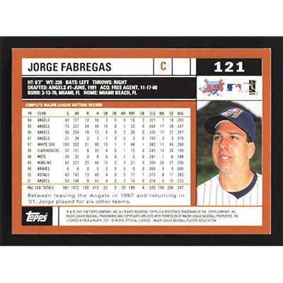 This is a 2002 Topps Jorge Fabregas baseball card. The card is #121 and pictures show condition.