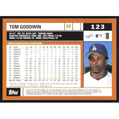 This is a 2002 Topps Tom Goodwin baseball card. The card is #123 and pictures show condition.