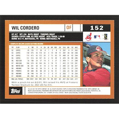 This is a 2002 Topps Wil Cordero baseball card. The card is #152 and pictures show condition.