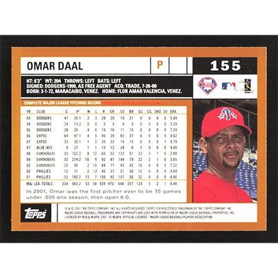 This is a 2002 Topps Omar Daal baseball card. The card is #155 and pictures show condition.