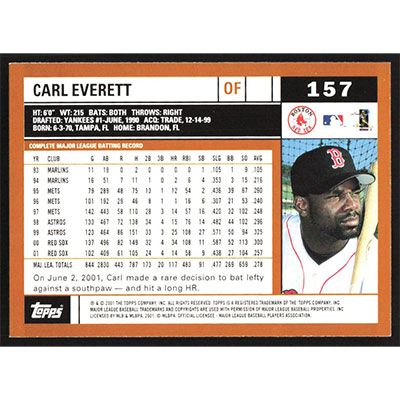 This is a 2002 Topps Carl Everett baseball card. The card is #157 and pictures show condition.