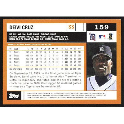 This is a 2002 Topps Deivi Cruz baseball card. The card is #159 and pictures show condition.