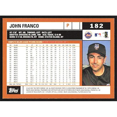 This is a 2002 Topps John Franco baseball card. The card is #182 and pictures show condition.