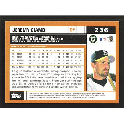 This is a 2002 Topps Jeremy Giambi baseball card. The card is #236 and pictures show condition.