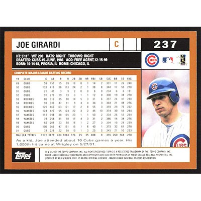 This is a 2002 Topps Joe Girardi baseball card. The card is #237 and pictures show condition.