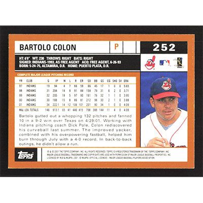 This is a 2002 Topps Bartolo Colon baseball card. The card is #252 and pictures show condition.