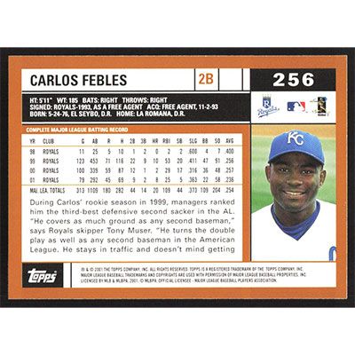 This is a 2002 Topps Carlos Febles baseball card. The card is #256 and pictures show condition.