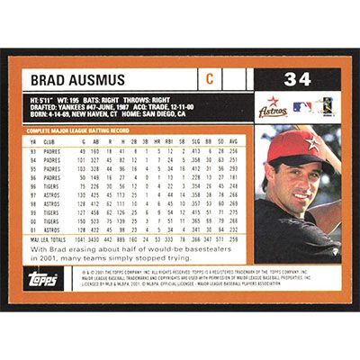 This is a 2002 Topps Brad Ausmus baseball card. The card is #34 and pictures show condition.