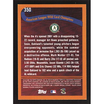 This is a 2002 Topps Oakland Athletics Playoff Bound baseball card. The card is #350 and pictures show condition.