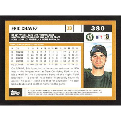 This is a 2002 Topps Eric Chavez baseball card. The card is #380 and pictures show condition.