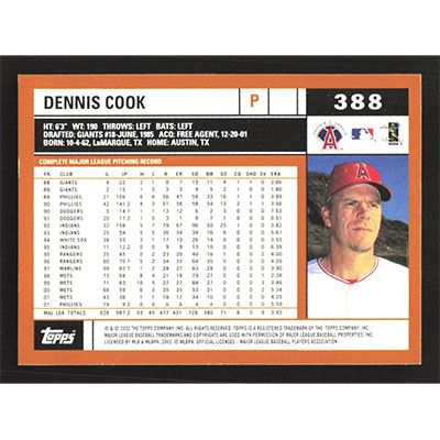 This is a 2002 Topps Dennis Cook baseball card. The card is #388 and pictures show condition.
