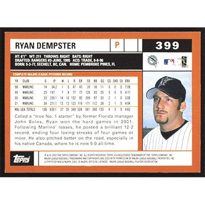 This is a 2002 Topps Ryan Dempster baseball card. The card is #399 and pictures show condition.