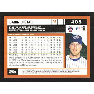 This is a 2002 Topps Darin Erstad baseball card. The card is #405 and pictures show condition.