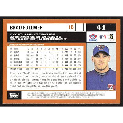 This is a 2002 Topps Brad Fullmer baseball card. The card is #41 and pictures show condition.
