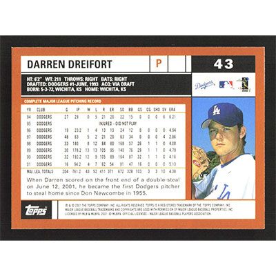 This is a 2002 Topps Darren Dreifort baseball card. The card is #43 and pictures show condition.
