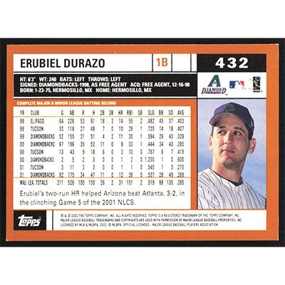 This is a 2002 Topps Erubiel Durazo baseball card. The card is #432 and pictures show condition.
