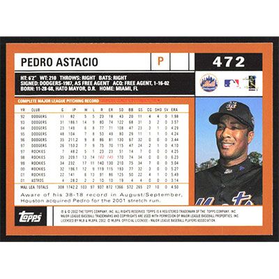 This is a 2002 Topps Pedro Astacio baseball card. The card is #472 and pictures show condition.