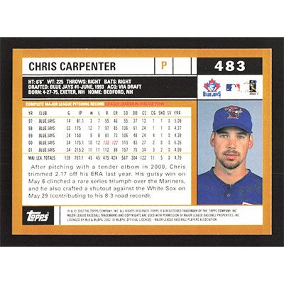This is a 2002 Topps Chris Carpenter baseball card. The card is #483 and pictures show condition.