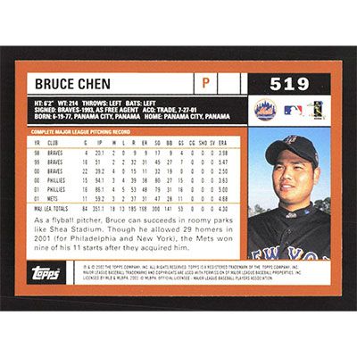 This is a 2002 Topps Bruce Chen baseball card. The card is #519 and pictures show condition.