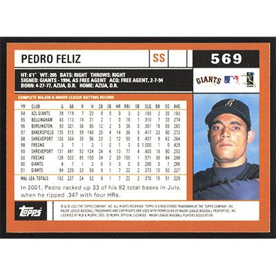 This is a 2002 Topps Pedro Feliz baseball card. The card is #569 and pictures show condition.